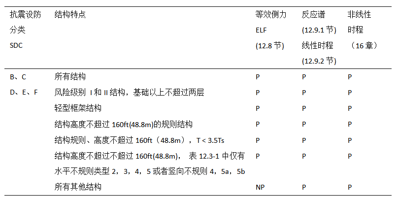 在分析結構地震作用效應時(shí),必須滿(mǎn)足ASCE 7 定義的分析方法、建模準則及其他要求。ASCE 7 提供三種分析方法,表12.6-1 列出了對不同參數條件下的分析方法。參數條件包括抗震設計類(lèi)別SDC、風(fēng)險級別、施工類(lèi)型、高度、不規則性。三個(gè)分析方法是(1)等效橫向荷載ELF方法 -- ASCE 7 $12.8;(2)振型反應譜(MRSA)方法 -- ASCE 7 $12.9;(3)地震反應時(shí)程方法 -- ASCE 7 第16章,包含線(xiàn)性和非線(xiàn)性方法。BRBF結構一般使用ELF方法和MRSA方法。